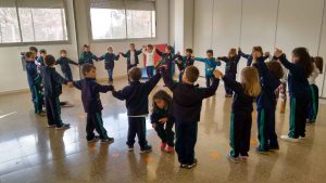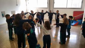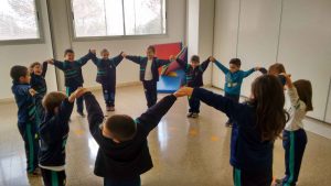 Després vam jugar al “Joc del tortell”: Un grup es va convertir en tortell agafant-se amb les mans alçades i en rotllana; i la resta de nens/es es van convertir en cireres i havien d’anar entrant i sortint de la rotllana tot travessant-la sense trencar el tortell. La cançó sonava però en un moment donat la música parava i els infants de la rotllana baixaven les mans atrapant cireres per fer més gran el tortell.