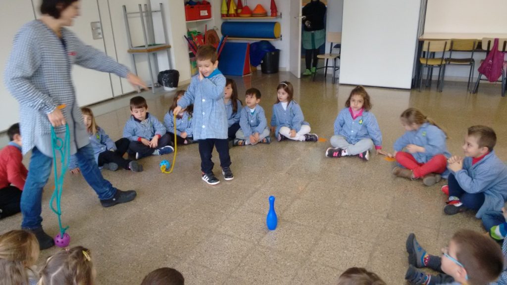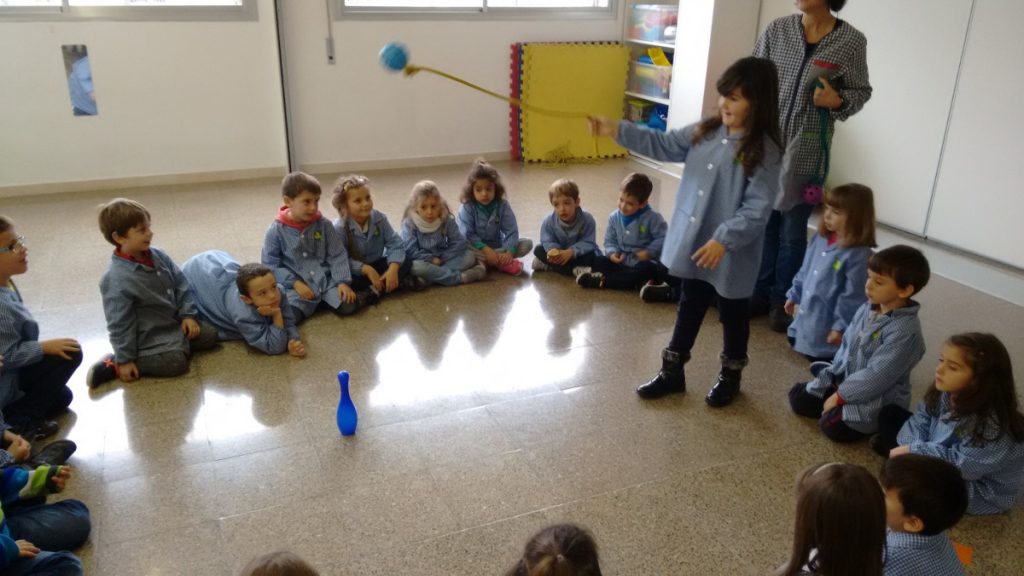 Posem una bitlla a una distància i observem què sense moure’ns d’un punt, només la podem llençar amb el pèndol de la corda llarga.