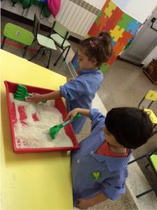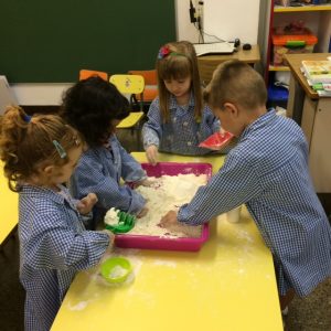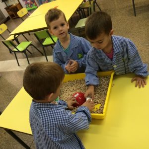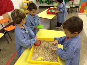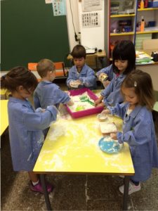 Ahir els nens/es de P3 varen fer dues activitats molt divertides. Un grup experimentava amb farina, cigrons i arròs les possibilitats manipulatives dels diferents materials.