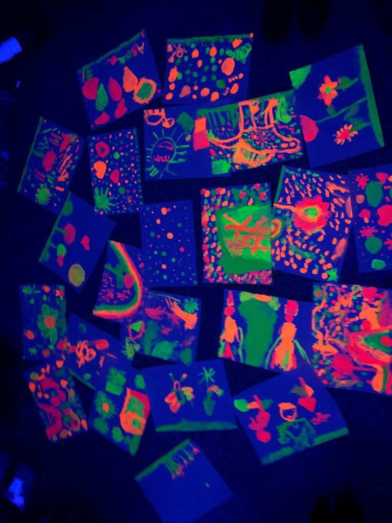 Com que avui tocava portar una llanterna, hem descobert amb papers de colors a través de la llum com podem fer barreges. També pintem uns dibuixos ben bonics amb pintura fosforescent per veure’ls a la foscor amb la llum negra. A la tarda jugarem amb les samarretes blanques, les llanternes i la foscor, a veure què passa?