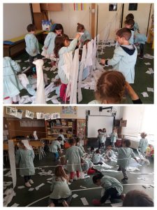 Avui hem fet un nou gir al conte dels tres porquets. Què hauria  passat si els tres poquets construïssin una casa de paper? Després de proposar entre tots diferents finals al nostre conte, ens hem convertit en els protagonistes i hem intentat construir una casa de paper.
