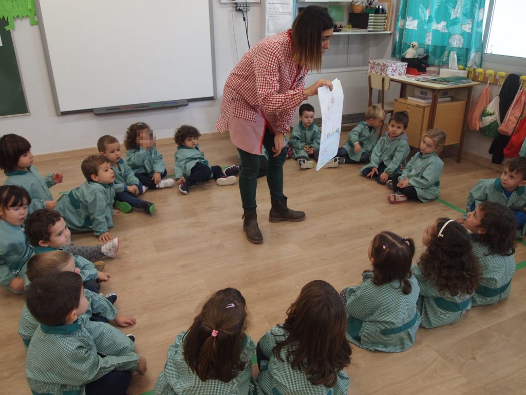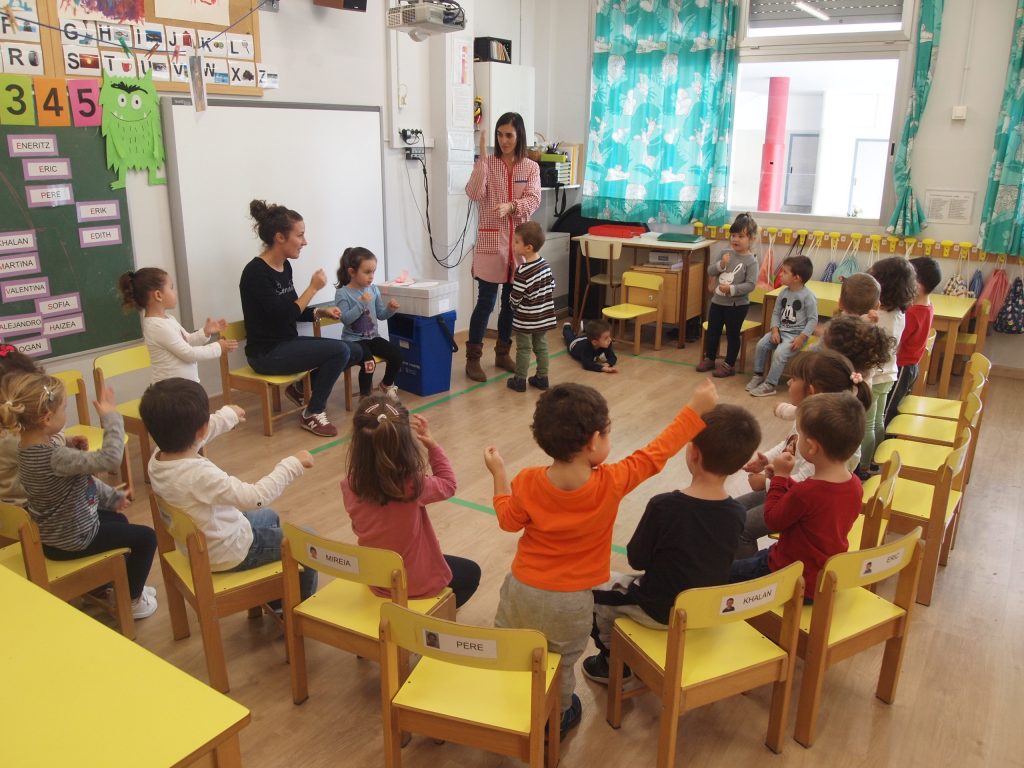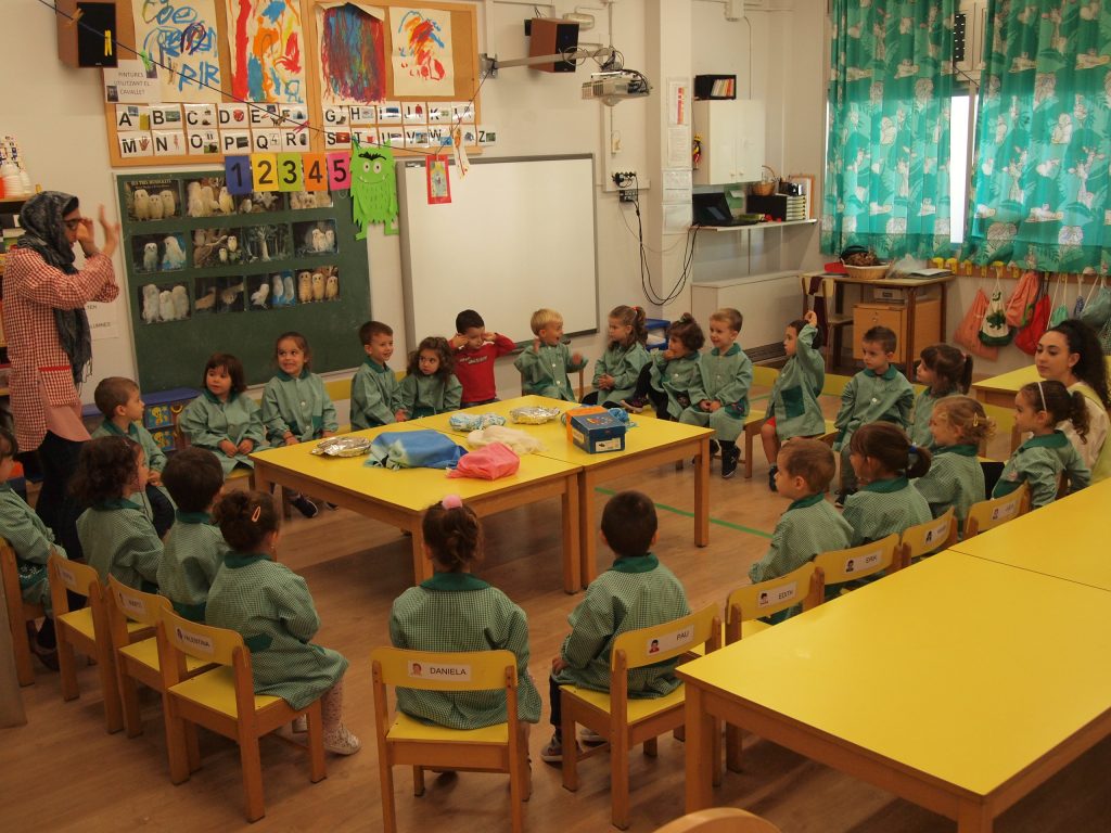 # Primera immersió lingüística a la llengua anglesa: els infants s’han de familiaritzar amb la llengua i aprendre les primeres nocions comunicatives. Es fan dues hores setmanes d’anglès, una amb el grup classe i una altra amb grup desdoblat (12/13 infants).