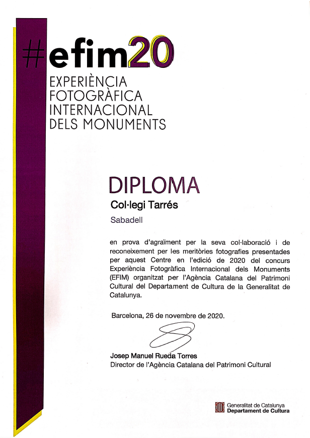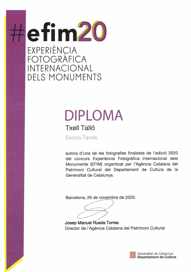 L’alumna de l’Escola fins al curs 2019-2020, Txell Talló, ha resultat finalista del concurs de fotografia i patrimoni Experiència Fotogràfica Internacional dels Monuments (EFIM) en la seva edició del 2020. Aquest concurs, promogut pel Consell d’Europa i organitzat a Catalunya a través de la Agència Catalana de Patrimoni Cultural del Departament de Cultura, pretén apropar als joves d’entre 12 i 18 anys el patrimoni monumental, a través de la fotografia i les xarxes socials, per tal que el coneguin, el valorin i el gaudeixin.