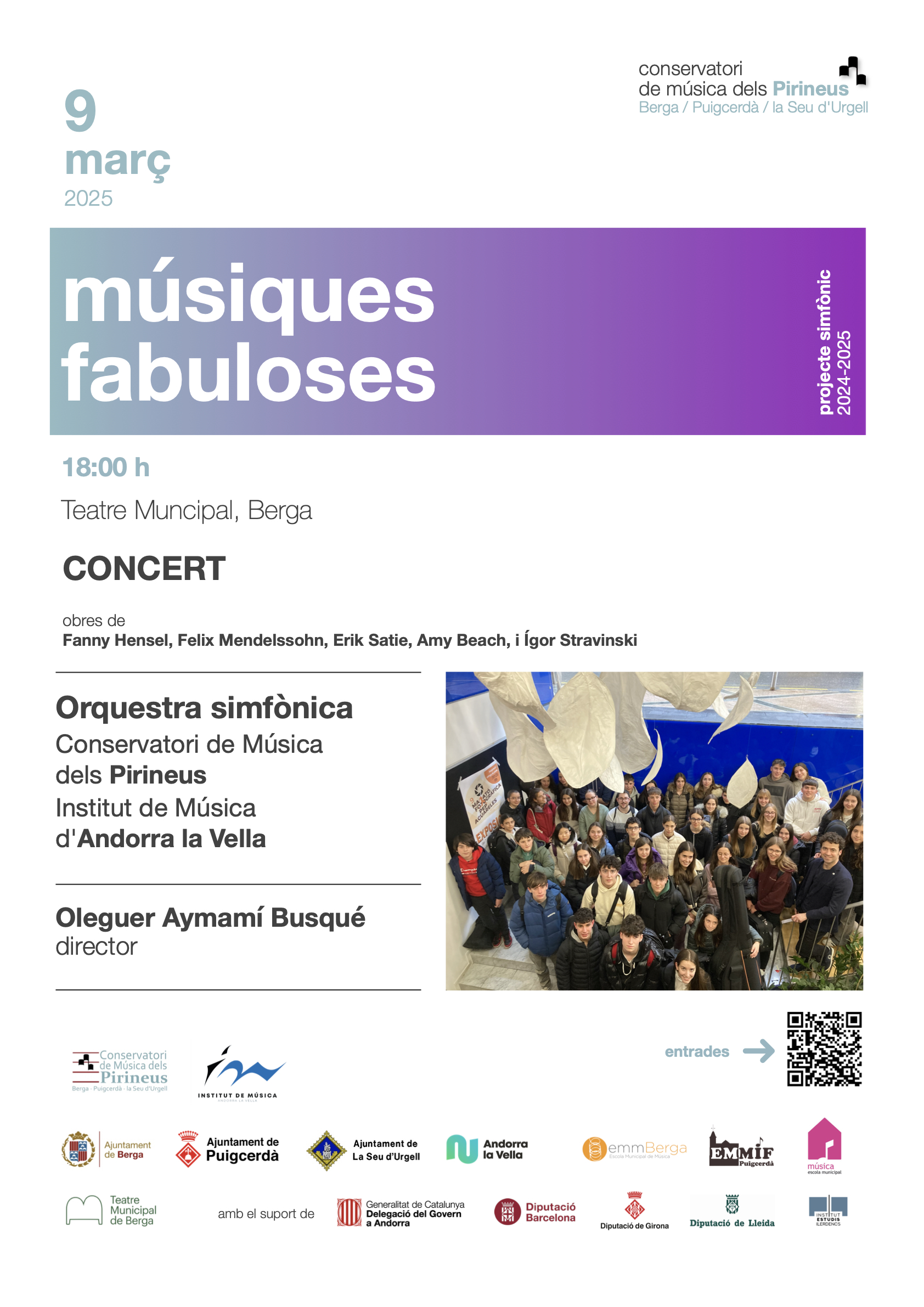 L’Institut de Música d’Andorra la Vella i el Conservatori de Música dels Pirineus de Berga, Puigcerdà i la Seu d’Urgell, han treballat des del mes de gener els Concerts del projecte simfònic conjunt que es portaran a terme aquest cap de setmana. Concretament el dissabte 8 de març a les 18 h al Centre de congressos d’Andorra la Vella i el diumenge 9 de març a les 18h al Teatre Municipal de Berga. Sota el títol “Músiques fabuloses” els centres educatius musicals clouran el Projecte Simfònic del curs 2024-2025.