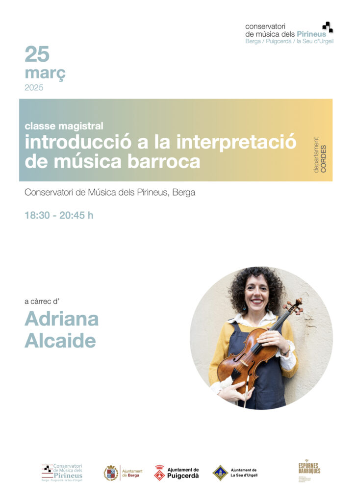 Aquest dimarts ha tingut lloc a la seu de Berga una classe d’introducció a la música barroca a càrrec d’Adriana Alcalde, violinista especialista en música antiga. L’alumnat de corda del conservatori ha pogut gaudir de la classe que l’ofereix el festival Espurnes Barroques amb el suport de l’Ajuntament de Berga.