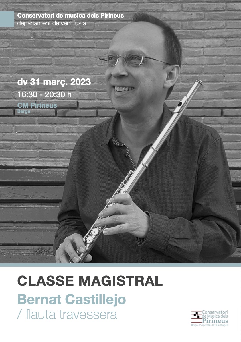 Aquest divendres 31 de març, el professor de flauta travessera, Bernat Castillejo, oferirà una classe magistral per a als alumnes de flauta travessera del Conservatori de música dels Pirineus. La classe tindrà lloc a la Seu de Berga.
