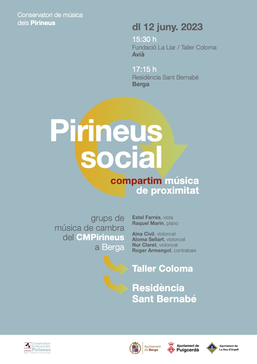 Després del primer concert a la Cerdanya, aquesta setmana continuem amb el projecte social del Conservatori dels Pirineus, amb la intenció de fer arribar la música a col·lectius específics com el del centre de treball del Taller Coloma de la Fundació la Llar o la Residència Sant Bernabé de Berga. Aquests concers van a càrrec de grups de cambra del conservatori.