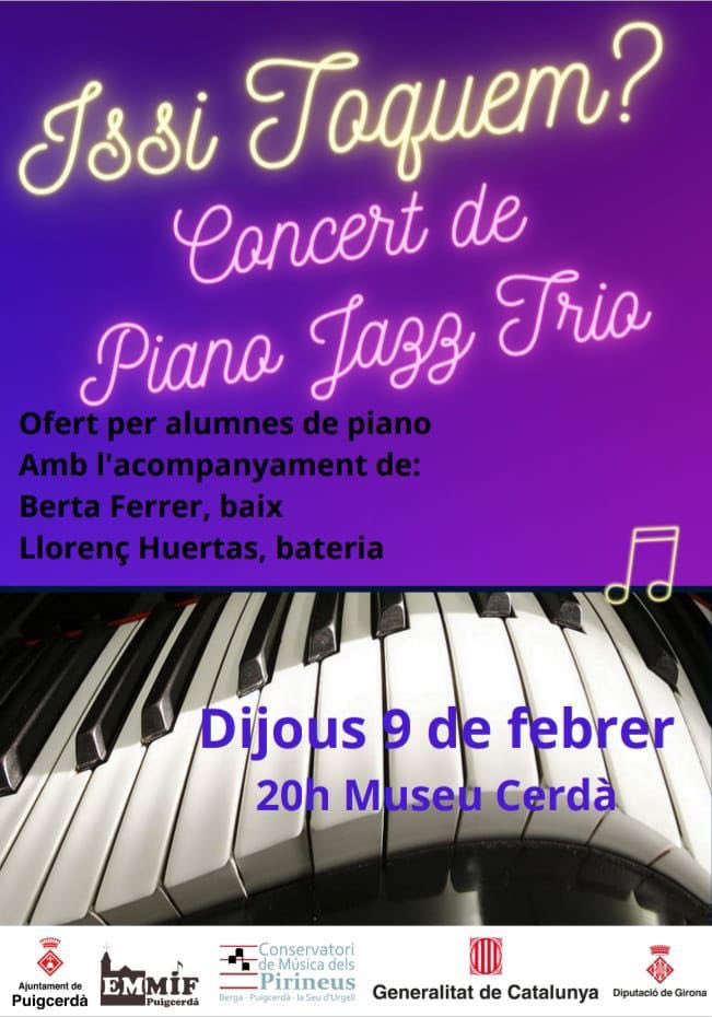 Aquest dijous a les 21.00 h. al Museu Cerdà de Puigcerdà tindrà lloc un concet de piano jazz Trio, ofert per l’alumnat de piano del Conservatori i l’Escola Municipal de Música Issi Fabra de Puigcerdà, acompanyats de Berta Ferrer al Baix Elèctric i Llorenç Huertas a la bateria.