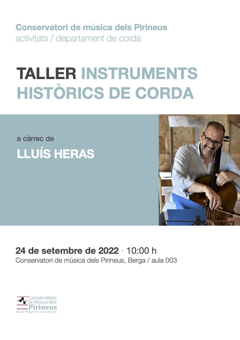 El violoncel·lista Lluís Heras, oferirà aquest dissabte a les 10.00 h. un taller d’instruments històrics de corda a la seu de Berga.