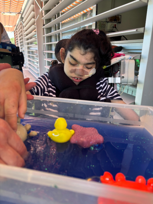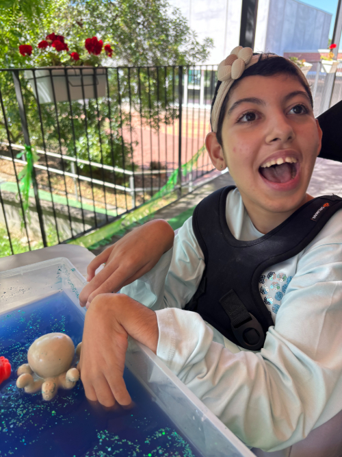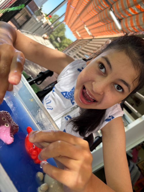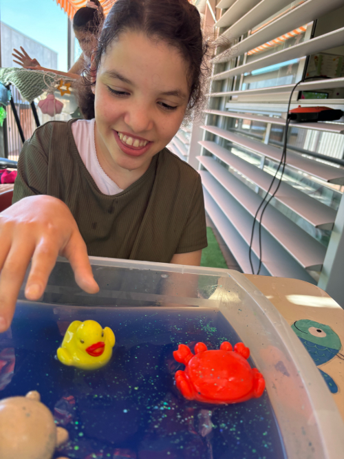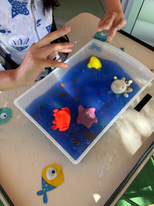 Hem preparat una safata sensorial plena d’aigua, boles de gel i figures d’animals marins -com un cranc, una estrella de mar i un pop- perquè poguessin explorar textures, temperatures i formes amb les mans i els sentits ben desperts.