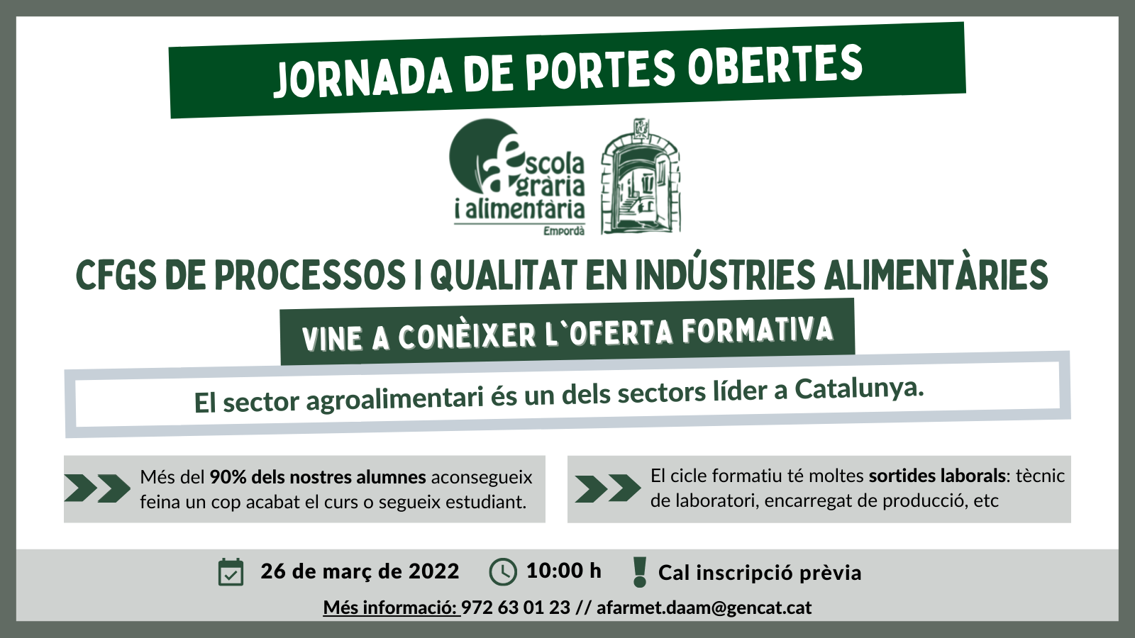 Vols conèixer l’Escola Agrària i Alimentària de l’Empordà? T’obrim les portes del centre el dia 26 de març amb inscripció prèvia!