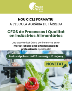 Nou Cicle Formatiu de Grau Superior de Processos i Qualitat en Indústries Alimentàries a l’Escola Agrària de Tàrrega