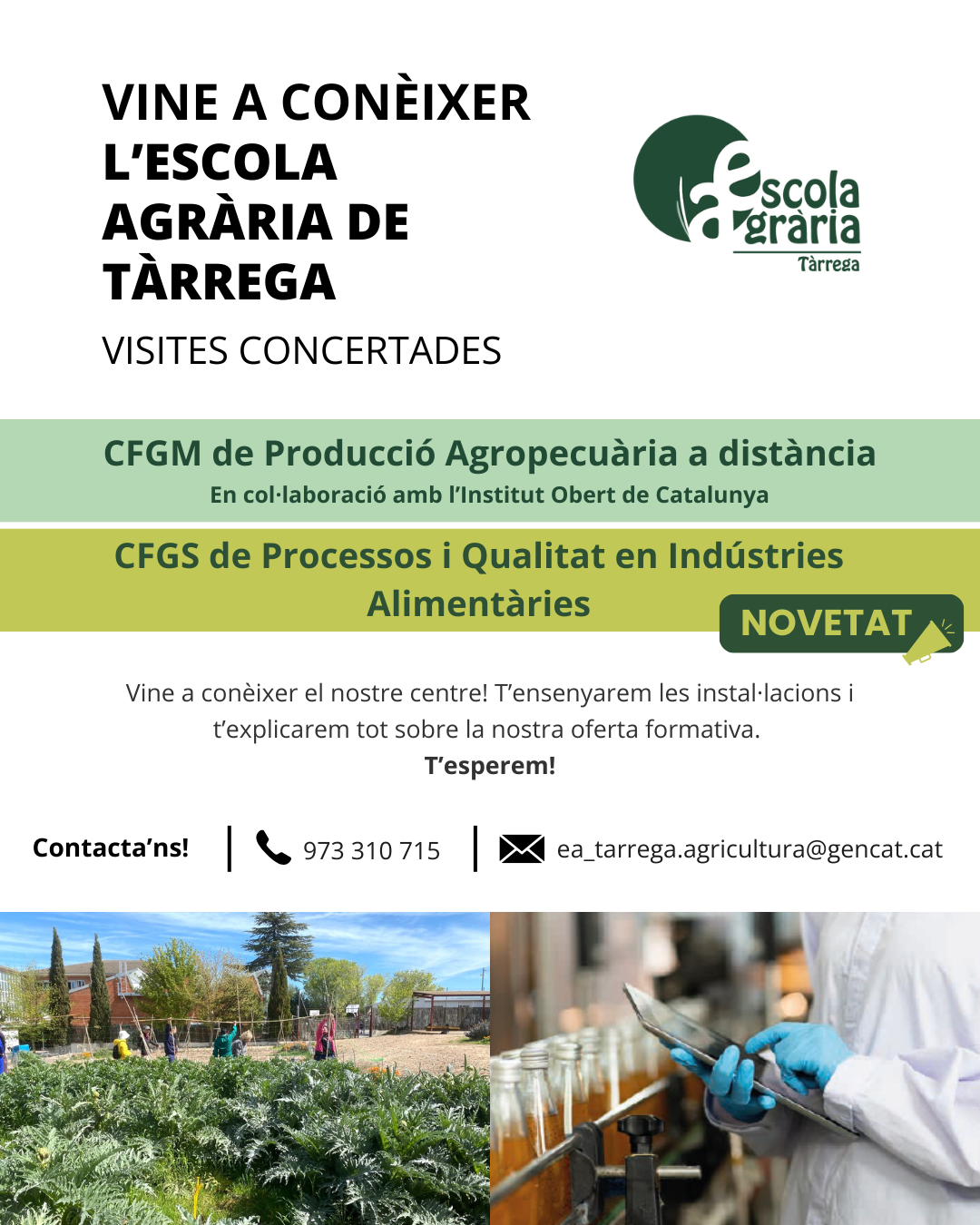 Si estàs pensant en el teu futur acadèmic o professional, o simplement vols conèixer millor el centre, les visites concertades són la millor manera de fer-ho. Per concertar una visita, pots contactar amb l’escola a través del telèfon 973 310 715 o del correu electrònic ea_tarrega.agricultura@gencat.cat.