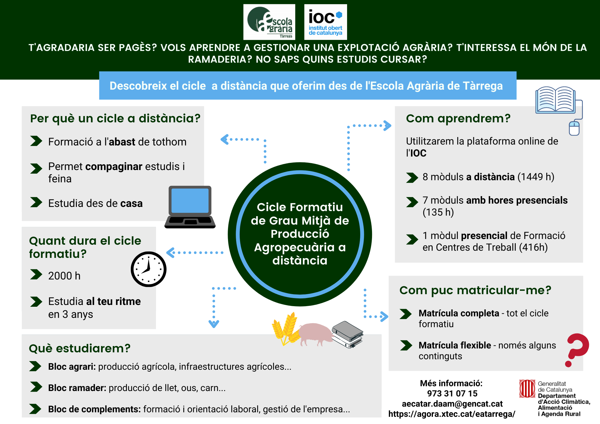 S’obren les preinscripcions a un nou semestre del Cicle Formatiu de Grau Mitjà de Producció Agropecuària a distància del 7 al 17 de novembre de 2023, uns estudis de formació professional en col·laboració amb l’Institut Obert de Catalunya (IOC).