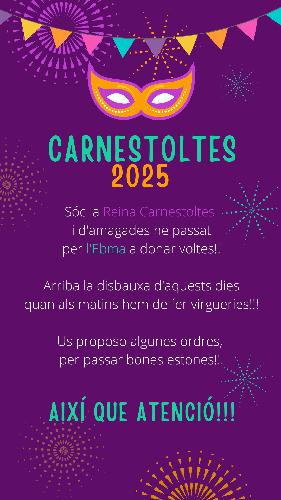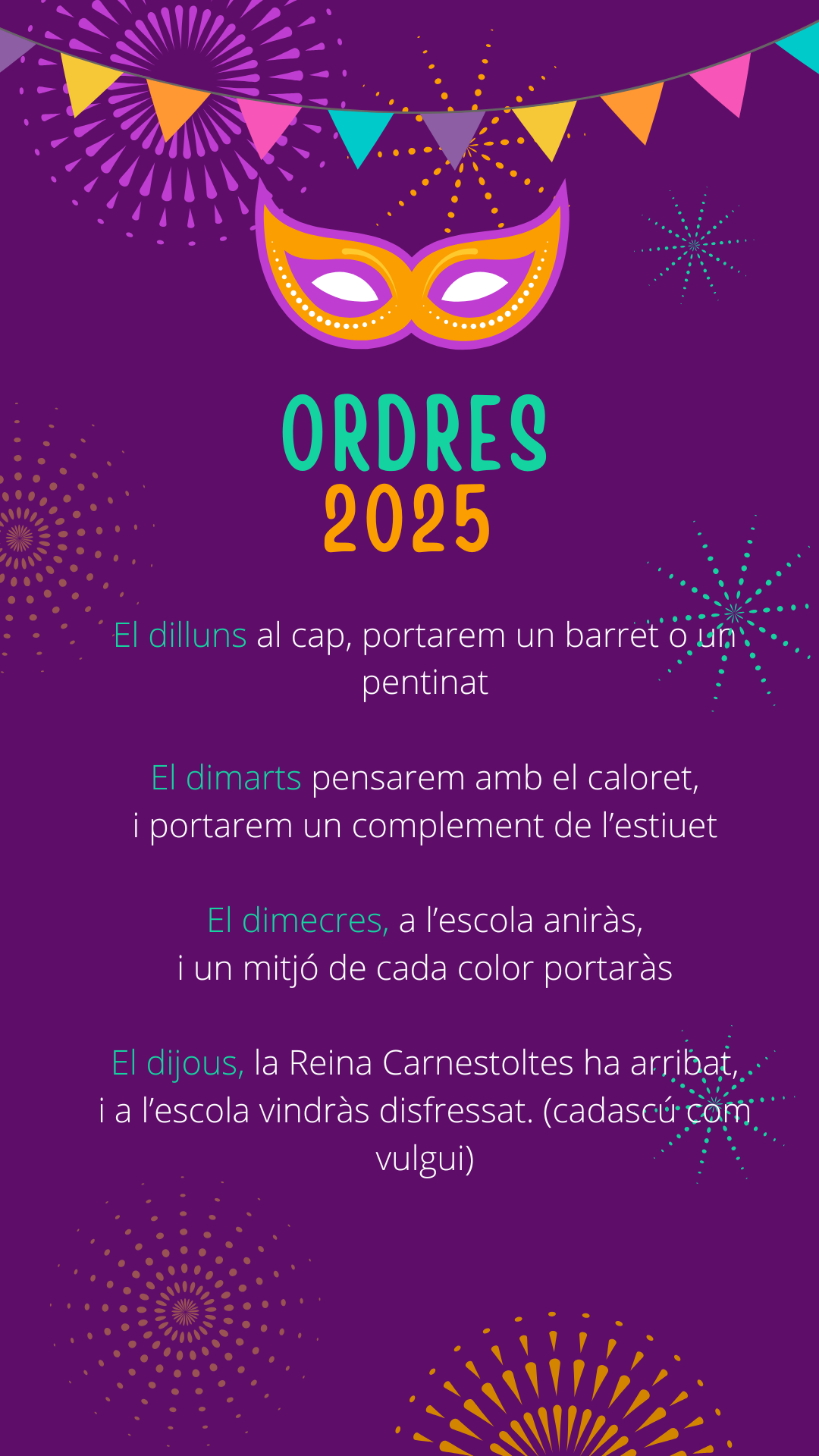 27/02/25Aquests dies, a l’escola ens omplirem de colors i música, però tampoc hi faltaran les divertides ordres de la Reina Carnestoltes.