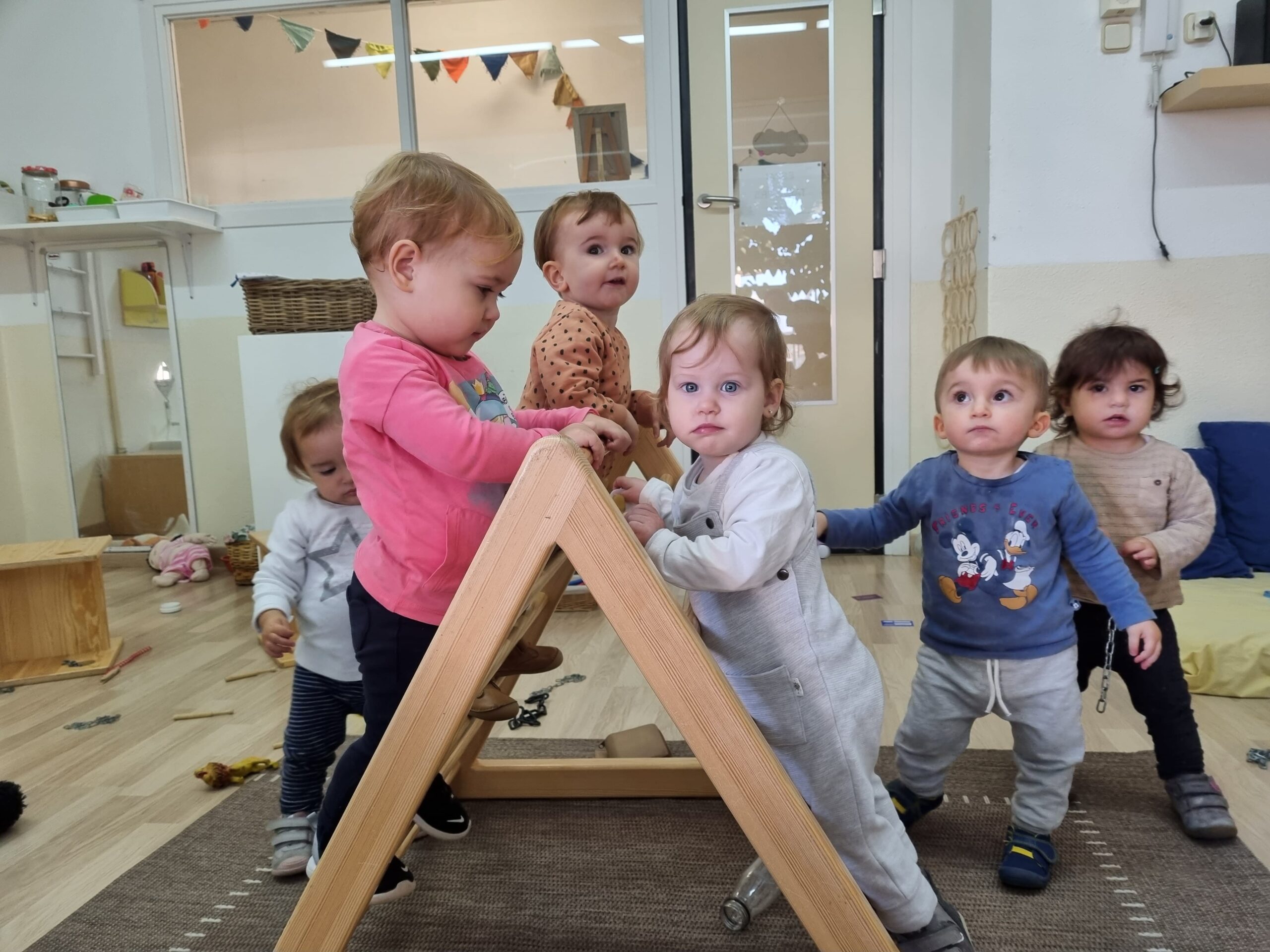 Com és normal el seu joc és encara molt individual i van apareixent espontàniament petits moments on es relacionen els uns amb els altres. S’interessen per la pipa de l’altre, per les seves sabates o el jersei, per agafar-se un objecte, per imitar el que està fent, etc. (Val a dir que també competeixen per l’exclusivitat de la nostra falda…) I ens emocionem en veure’ls somriure’s, mirar-se amb complicitat. Perquè, el nostre objectiu, per sobre de tot, és que siguin feliços!