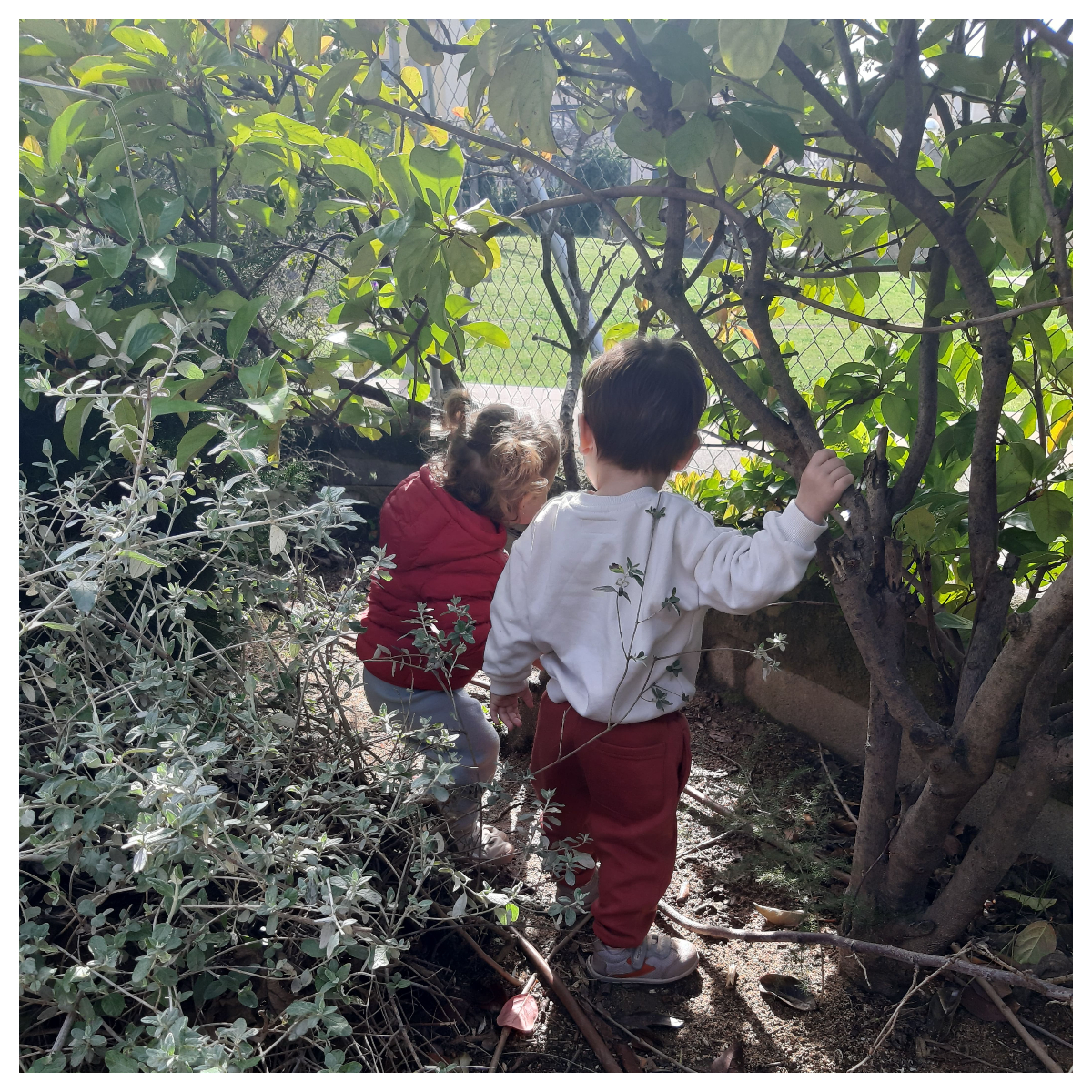 L’exploració i l’experimentació prenen protagonisme. Jugant al sorral: transvasant, omplint i buidant diferents recipients; explorant darrere els matolls; manipulant elements naturals com pedres, troncs, fulles…