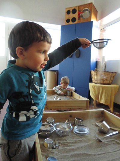 Taules d’experimentació amb elements naturals: sorra, pells de taronja, petxines, pols de mandarina… Omplir, buidar, travessar, olorar, temperatura del material… hi ha moltes possibilitats. Els oferim recipients de diferents materials i mides: pots d’acer, coladors, culleres, cullerots, embuts, sedassos..