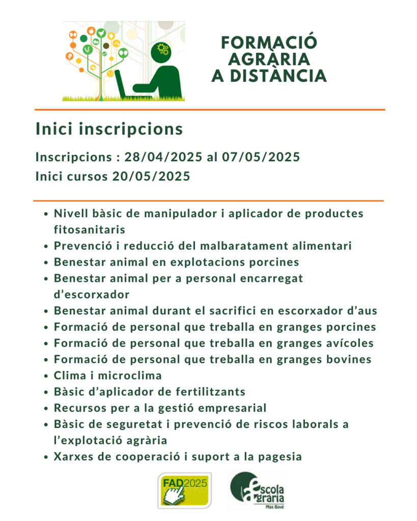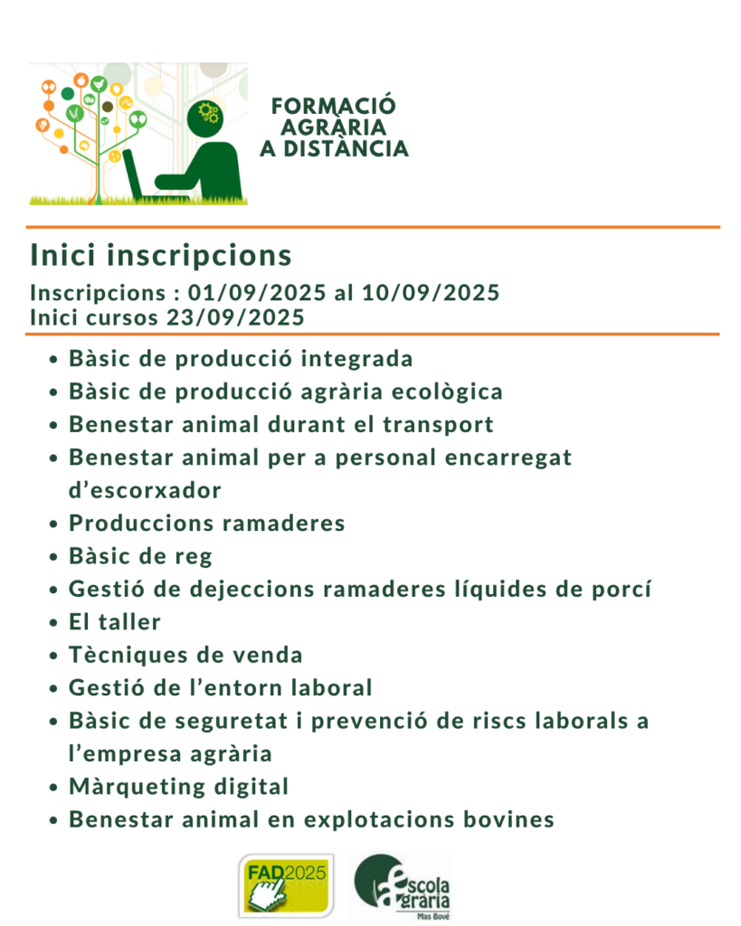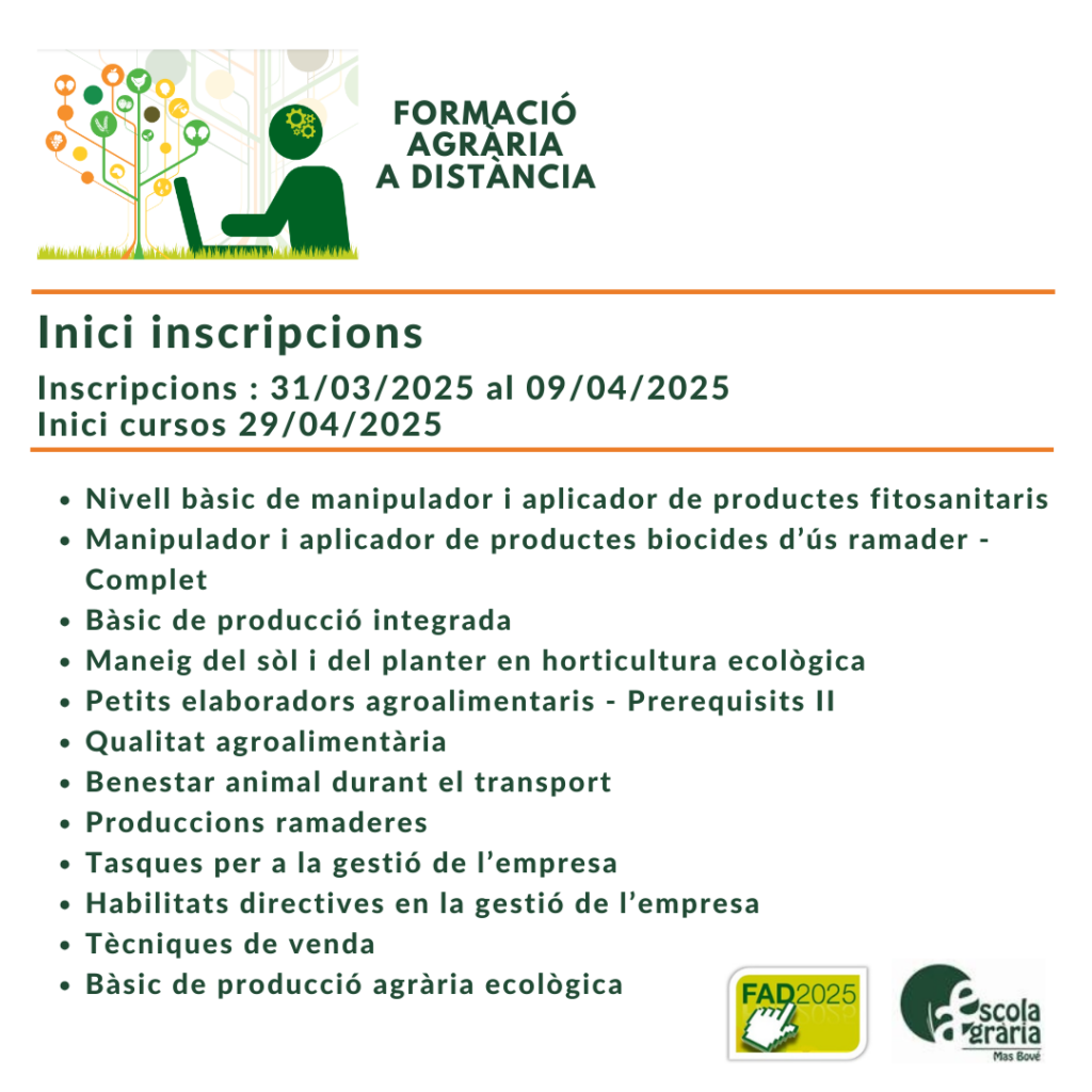 A partir del dilluns 17 de novembre s’inicien les inscripcions als següents cursos de Formació Agrària a Distància. Una oportunitat per ampliar coneixements i seguir creixent en el sector agroalimentari amb flexibilitat! 📌 Recorda: Alguns d’aquests cursos tenen sessió presencial obligatòria i/o examen presencial. Consulta tota la informació abans de fer la inscripció! 👉 Consulta