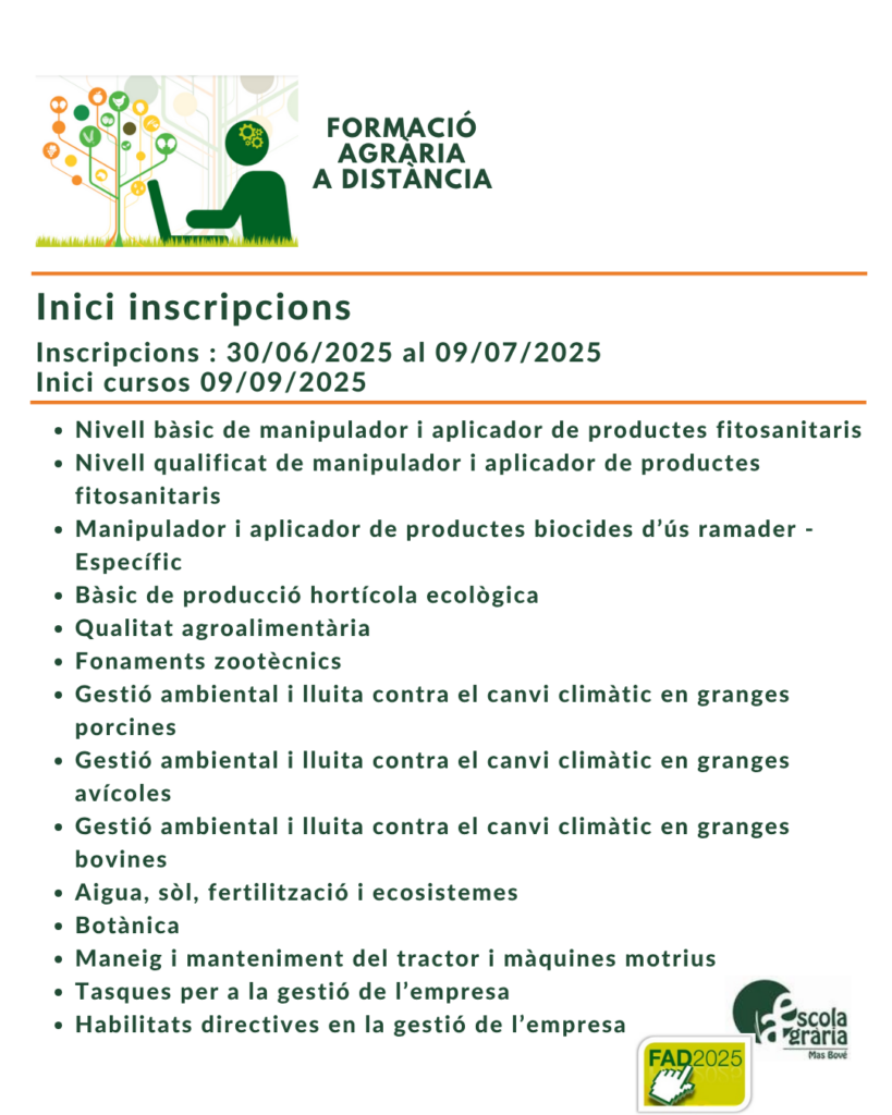 El proper 30 de juny s’obriran les inscripcions per a 14 cursos de Formació Agrària a Distància (FAD). Aquesta oferta formativa està orientada a professionals del sector i a persones interessades a ampliar els seus coneixements en àrees específiques de l’agricultura, ramaderia i gestió empresarial, que volen una formació a distància. Dates d’inscripció: del 30