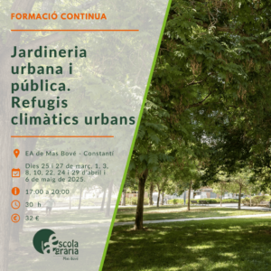 En aquest curs, explorarem com les tècniques de jardineria poden ajudar a mitigar els efectes del canvi climàtic a les ciutats. A través de la creació de refugis climàtics, aprendrem a dissenyar espais verds que proporcionin confort i biodiversitat en entorns urbans. Descobrirem com les plantes poden oferir protecció davant les altes temperatures, la contaminació i l’estrès tèrmic, millorant la qualitat de vida de les persones i els ecosistemes urbans.