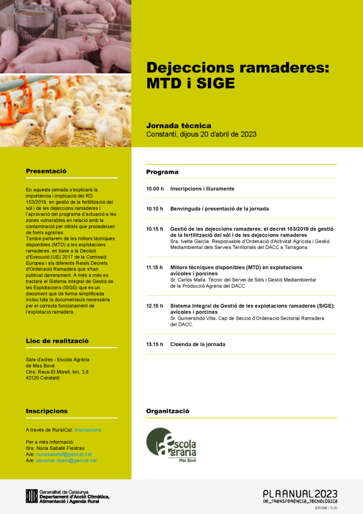 JT Dejeccions ramaderes: MTD i SIGE Feu un comentari / Per admin / 11/04/2023 / Formació i Transferència General Jornades Transferència Portada