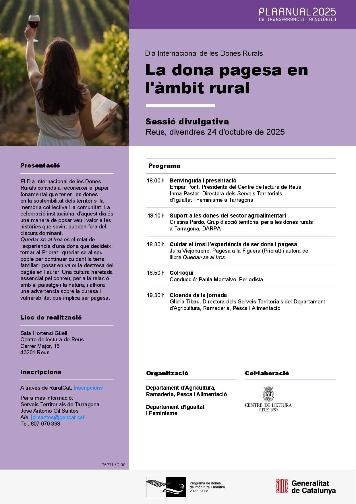 Aquest divendres 24 d’octubre, ens sumem a la celebració del Dia Internacional de les Dones Rurals amb una jornada molt especial que tindrà lloc al Centre de Lectura de Reus. Una iniciativa que reconeix el paper essencial de les dones en el món rural, en la sostenibilitat dels territoris i en la memòria col·lectiva.