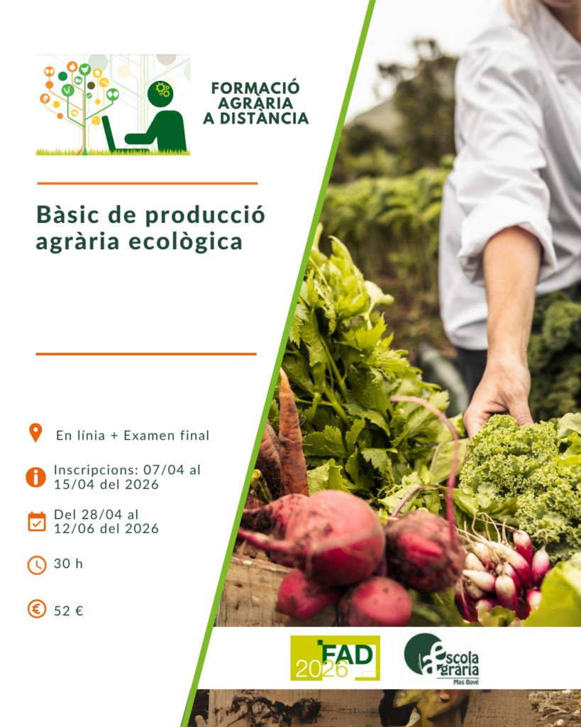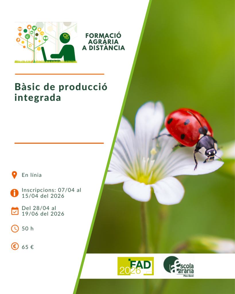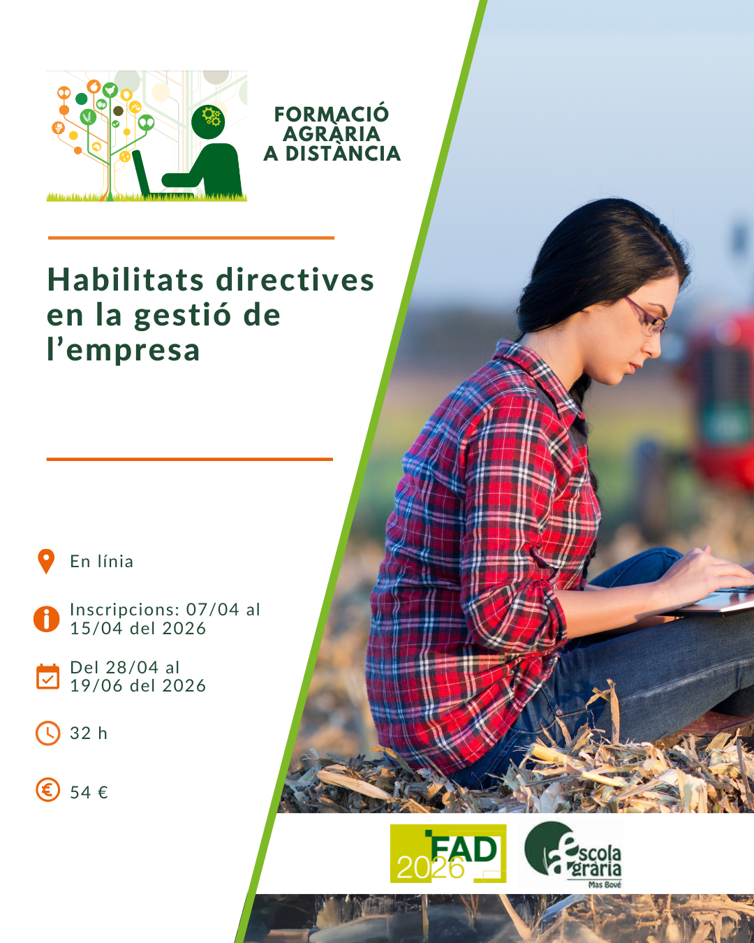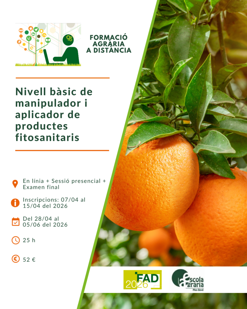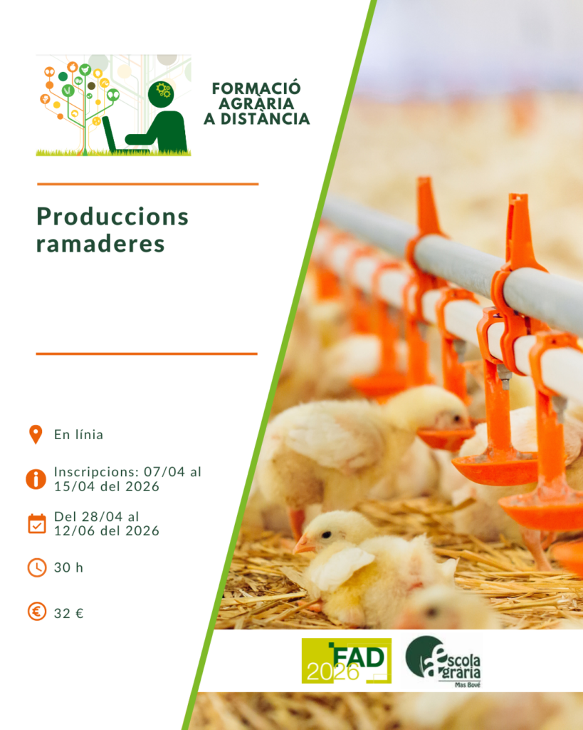 Des de l’Escola Agrària de Mas Bové obrim inscripcions per a una nova oferta de formació agrària a distància, pensada per donar resposta a les necessitats formatives del sector agroalimentari i ramader. Els cursos estan dissenyats per facilitar l’accés al coneixement tècnic i pràctic, amb una metodologia flexible i tutorització especialitzada.