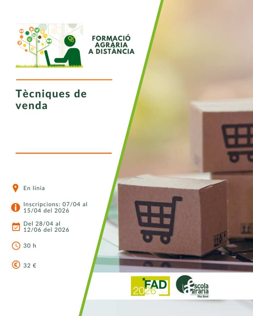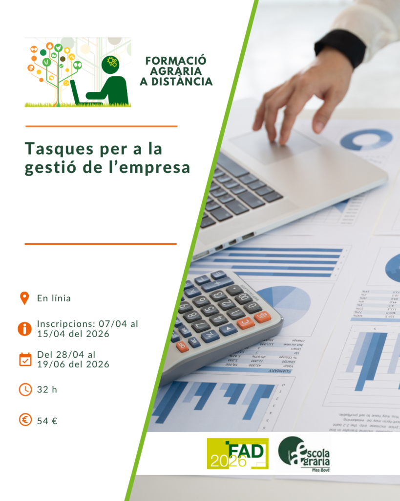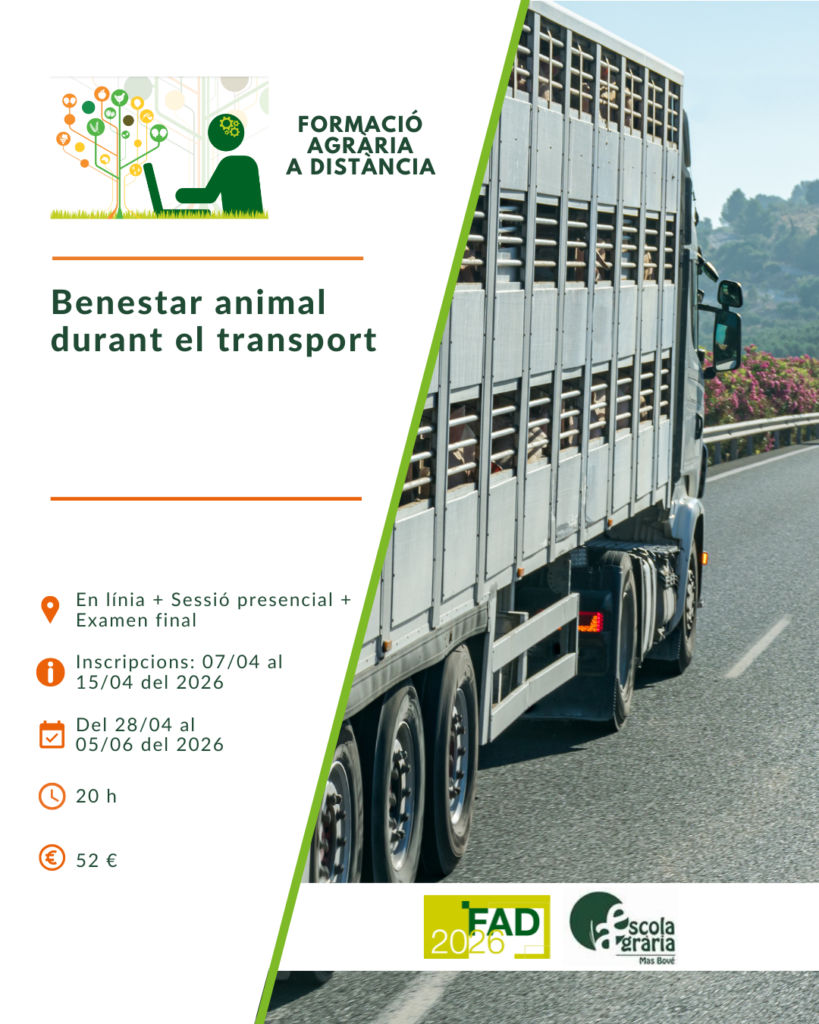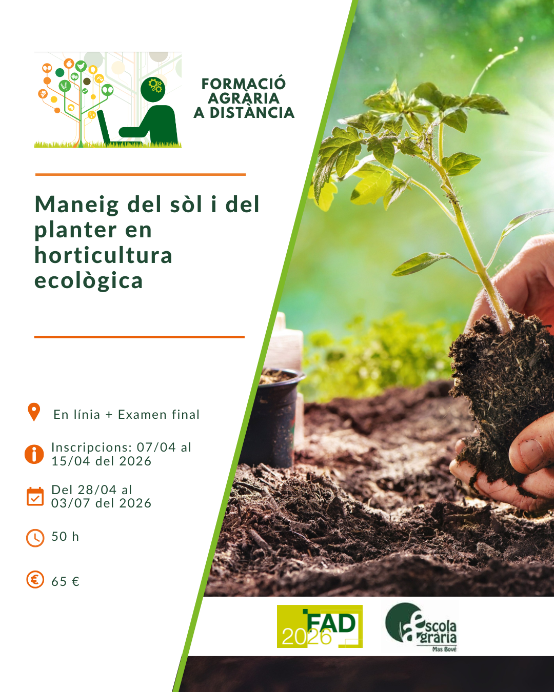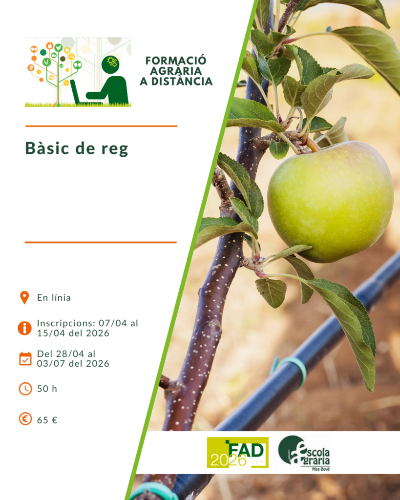 Des de l’Escola Agrària de Mas Bové obrim inscripcions per a una nova oferta de formació agrària a distància, pensada per donar resposta a les necessitats formatives del sector agroalimentari i ramader. Els cursos estan dissenyats per facilitar l’accés al coneixement tècnic i pràctic, amb una metodologia flexible i tutorització especialitzada.
