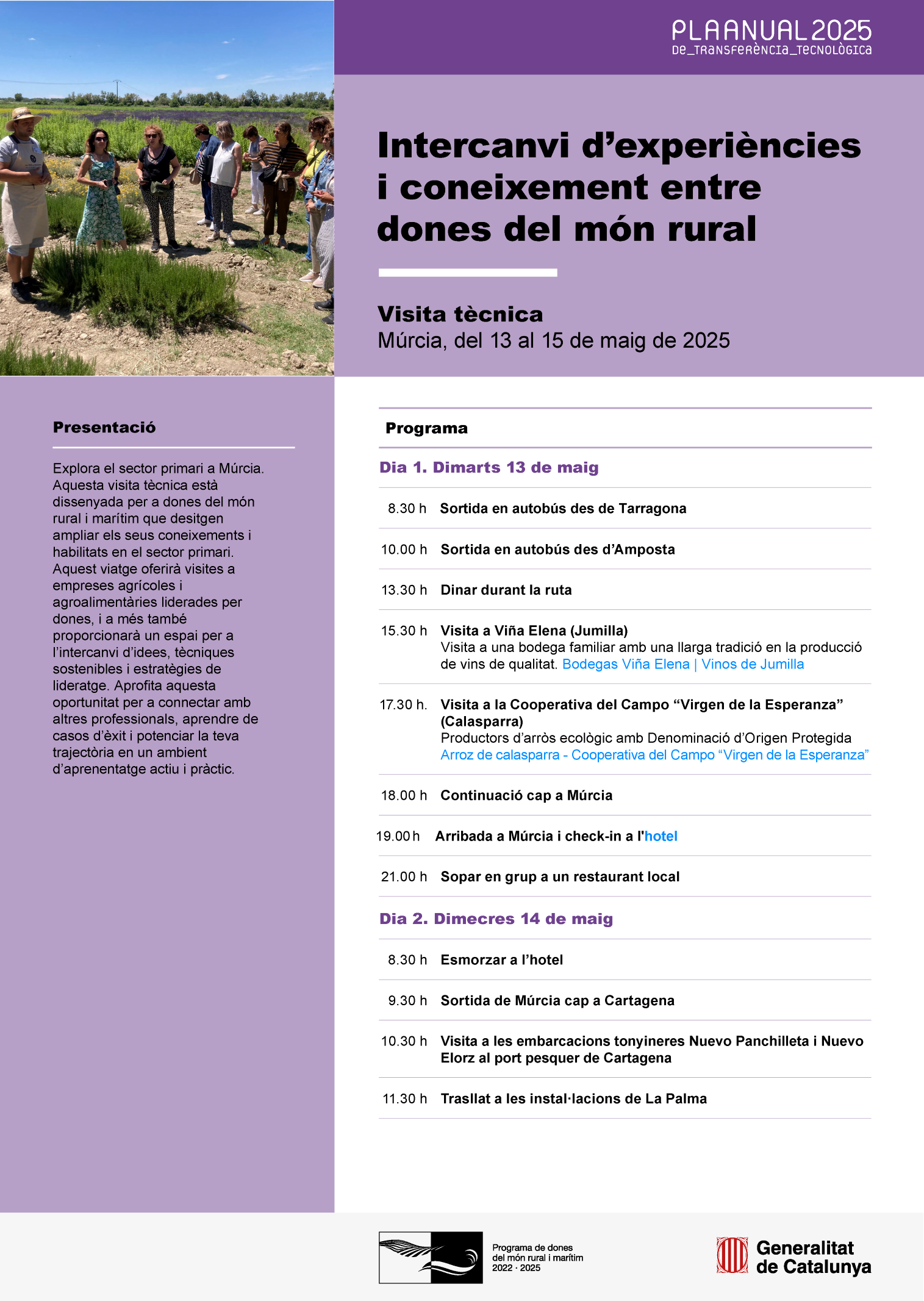 Us proposem una experiència única d’aprenentatge i intercanvi al cor del sector primari murcià. Aquesta visita tècnica està adreçada a dones vinculades al món rural i marítim que vulguin ampliar coneixements, descobrir bones pràctiques i reforçar el seu lideratge en àmbits agrícoles i agroalimentaris.