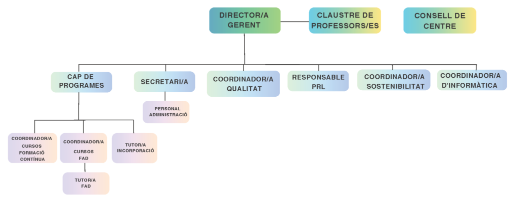 L’Escola Agrària de Mas Bové realitza una formació destinada a l’àmbit professional del sector agrari, ramader, forestal i agroalimentari. Donat l’abast i amplitud de tasques realitzades, es distribueix una organització amplia. Aquesta és la següent: