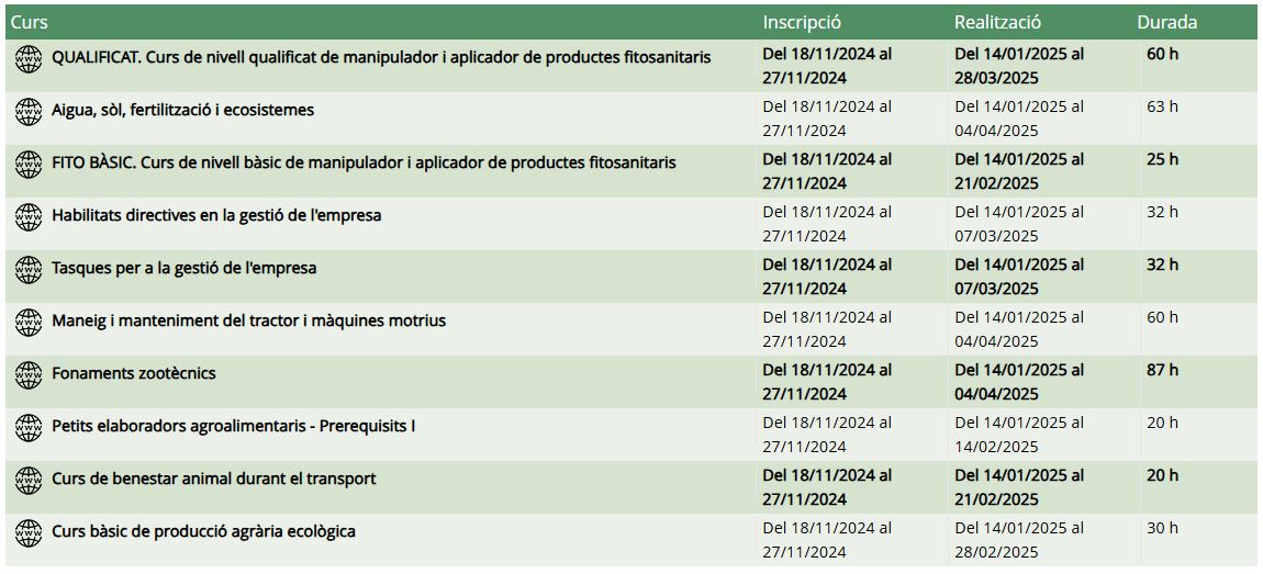 Des del 18 al 27 de novembre, teniu l’oportunitat d’inscriure-us a 10 cursos de Formació Agrària a Distància (FAD) que ofereixen continguts actualitzats i adaptats a les necessitats del sector agrari. Aquests cursos estan pensats per facilitar l’aprenentatge flexible i còmode, combinant la qualitat educativa amb la comoditat de la formació en línia.
