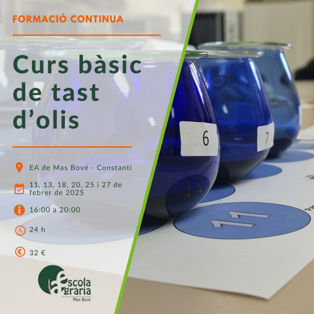 L’Escola Agrària de Mas Bové ha finalitzat una nova edició del Curs bàsic de tast d’olis, una formació que enguany ha arribat a la seva 16a edició, consolidant-se com una de les propostes formatives de referència per introduir-se en l’anàlisi sensorial de l’oli d’oliva. El curs, realitzat entre el 3 i el 19 de febrer […]