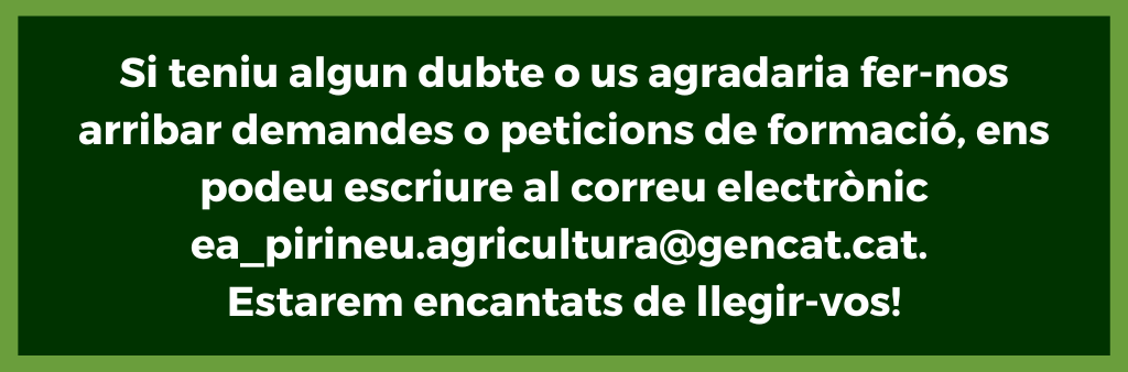 L’Escola Agrària del Pirineu també ofereix formació contínua en l’àmbit agroforestal de muntanya, el sector eqüestre i l’activitat formatgera, en forma de jornades tècniques emmarcades dins el Pla anual de Transferència Tecnològica de Departament d’Acció Climàtica, Alimentació i Agenda Rural, i de cursos de durada variable.