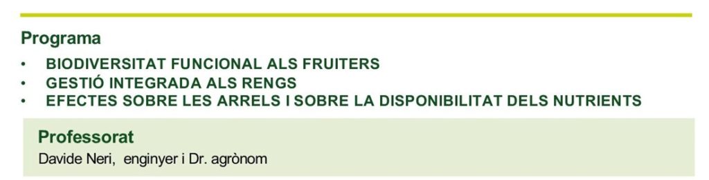 Una any més organitzem de la mà del especialista i Doctor Davide Neri, professor i director de la granja experimental de la Universitat Politècnica de les Marques, Itàlia, un Curs sobre gestió sostenible dels rengs dels arbres en fruiters.