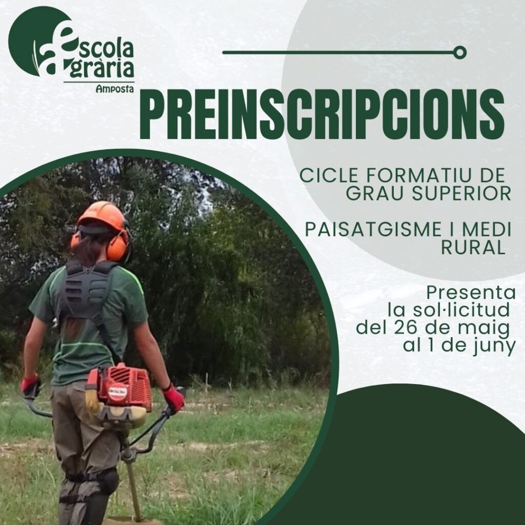 10/05/23Les dates de la preinscripció al Cicle de Grau Superior de Paisatgisme i Medi Rural. Vols estudiar a l’Escola? Accedeix a l’enllaç.