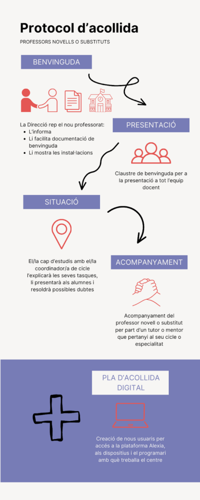 Per facilitar la incorporació del nou professorat, es compta amb un pla d’acollida entès com un conjunt d’actuacions sistematitzades i orientades a assolir l’èxit d’aquesta. L’equip directiu serà el responsable de rebre el nou professorat del centre, mostrant-li les instal·lacions i facilitant-li tota la informació que resulti pertinent respecte al funcionament de l’Escola, els projectes,