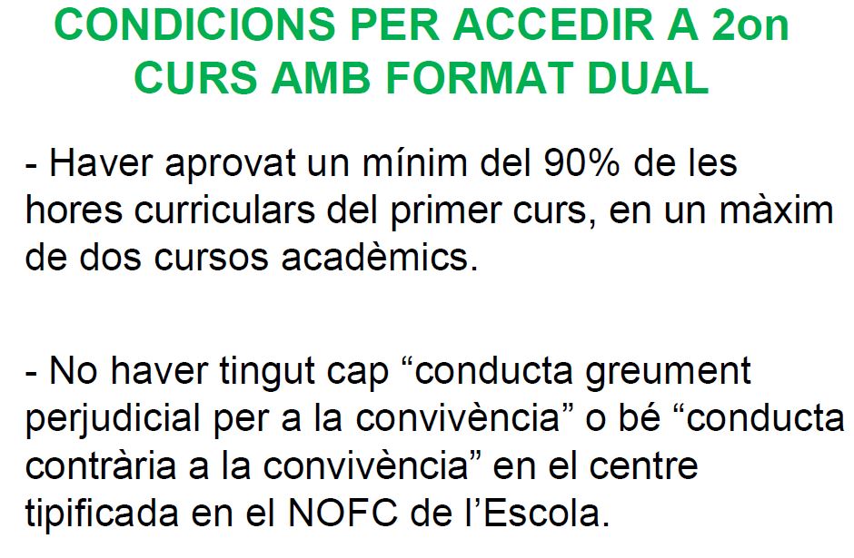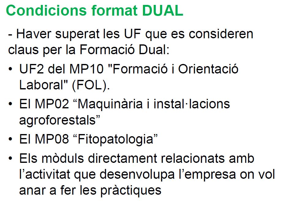 Els cicles que oferim són els 2 de la família agrària, concretament són el CFGS de Gestió Forestal i del Medi Natural i el CFGS de Paisatgisme i medi rural. els dos amb possibilitat de fer-se en modalitat DUAL.