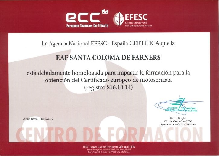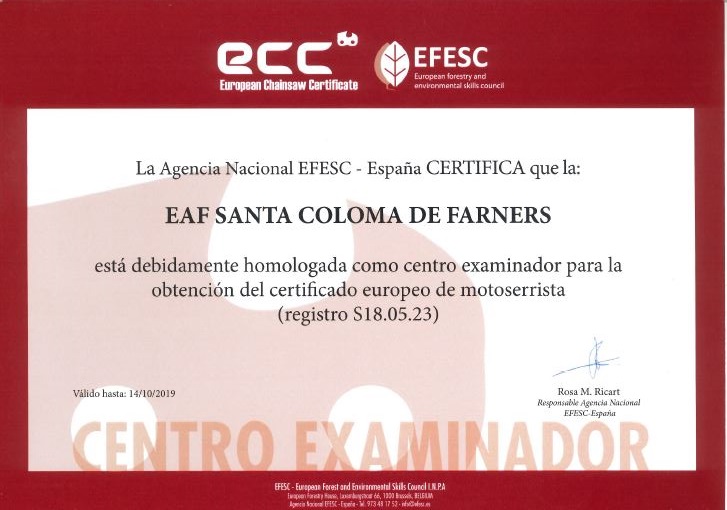 A l’Escola estem homologats per EFESC com a centre formador per impartir la formació per l’obtenció del certificats europeus de motoserristes (ECC) i també com a centre examinador.