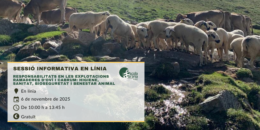 Des de l’Escola Agrària del Pallars, hem organitzat la sessió informativa en línia ‘Responsabilitats en les explotacions ramaderes d’oví i cabrum: higiene, sanitat, bioseguretat i benestar animal‘ que tindrà lloc el 6 de novembre de 2025.