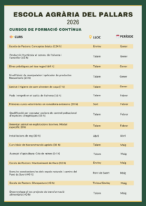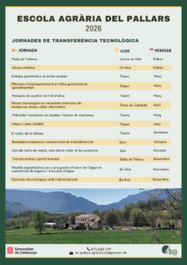 Consulta l’oferta de cursos de formació contínua i jornades tècniques de l’Escola Agrària del PallarsPer Escola Agrària del Pallars / 26/01/2026 / General Portada Us convidem a consultar l’oferta de cursos de formació contínua i jornades de transferència tecnològica de l’Escola Agrària del Pallars per l’any 2026: