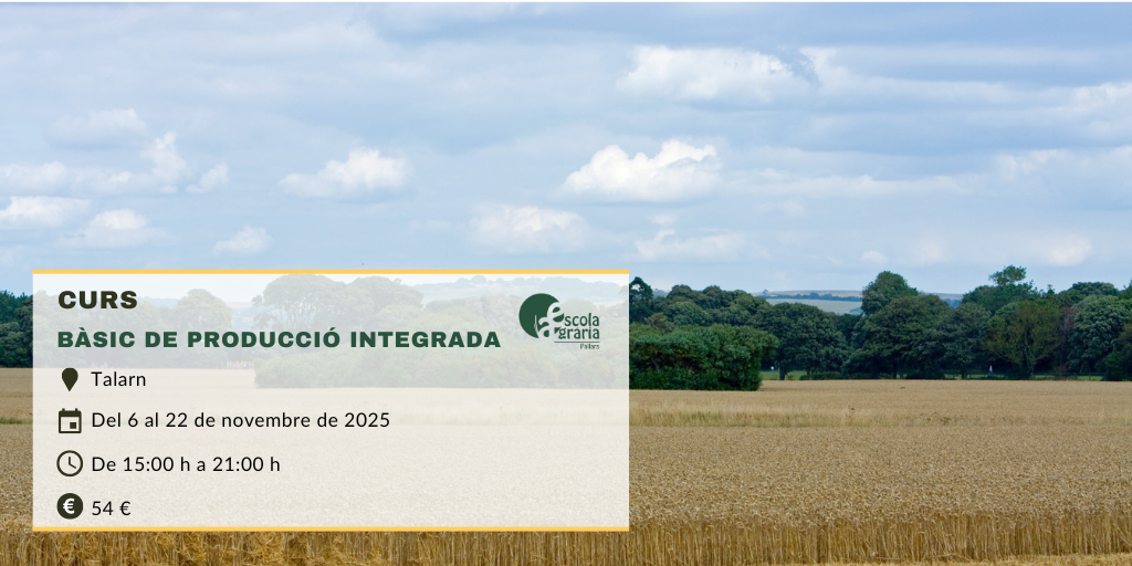 Des de l’Escola Agrària del Pallars, hem organitzat el curs ‘Bàsic de producció integrada‘ que tindrà lloc el 6, 10, 13, 15, 20, 21 i 22 de novembre de 2025 a Talarn.