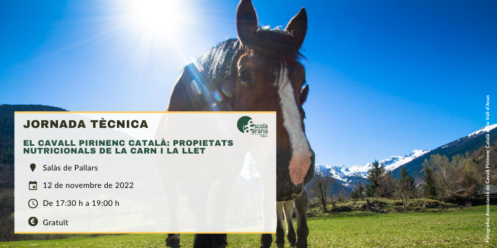 Des de l’Escola Agrària del Pallars, hem organitzat la jornada tècnica ‘El cavall pirinenc català: propietats nutricionals de la carn i la llet’ que tindrà lloc el 12 de novembre dins el marc de la XVII Diada Fira de Salàs.