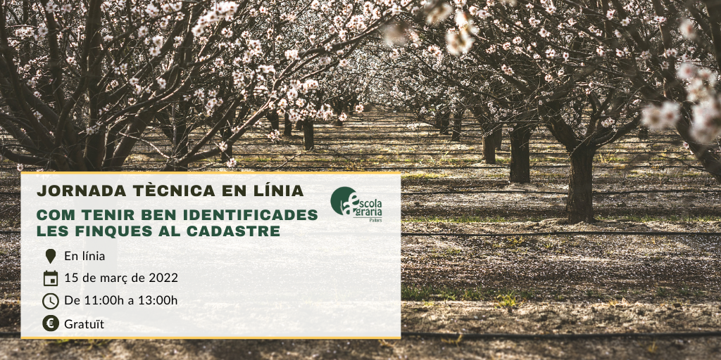 Des de l’Escola Agrària del Pallars et convidem a assistir a la jornada tècnica en línia ‘Com tenir ben identificades les finques al cadastre’ que tindrà lloc el 15 de març de 2022.