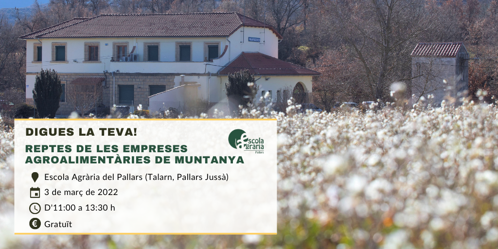 Des de l’Escola Agrària del Pallars us convidem a participar en la jornada ‘Reptes de les empreses agroalimentàries de muntanya. Digues la teva!’ que tindrà lloc el dijous 3 de març de 2022.