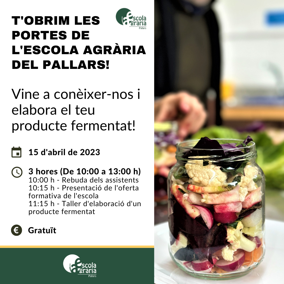 Vols estudiar el curs ‘Eines per a la transformació agroalimentària de muntanya’ que impartim a l’Escola Agrària del Pallars? T’agradaria aprendre a elaborar el teu propi fermentat? El dissabte 15 d’abril t’obrim les portes del centre!