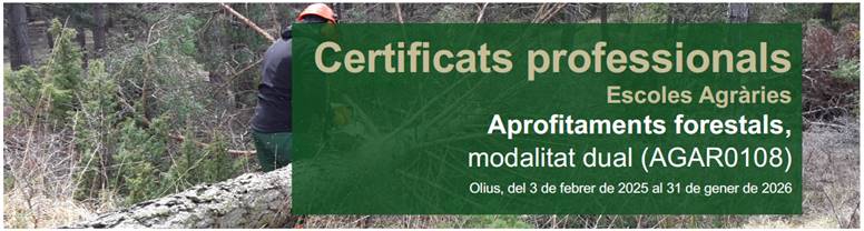 L’Escola Agrària del Solsonès, en tant que entitat formadora, ha coordinat entre el gener del 2025 i el gener de 2026 el certificat professional «Aprofitaments forestals, modalitat dual» amb l’objectiu que les persones en situació de desocupació, sense qualificació o amb un nivell baix de formació puguin millorar l’ocupabilitat mitjançant la formació dual. Es tracta d’un certificat professional i un contracte de formació en alternança emparat en la convocatòria 2024 del Programa Formació Professional Ocupacional Dual (Resolució EMT/2747/2024, de 22 de juliol), i amb el Consell Comarcal del Solsonès com a entitat impulsora.
