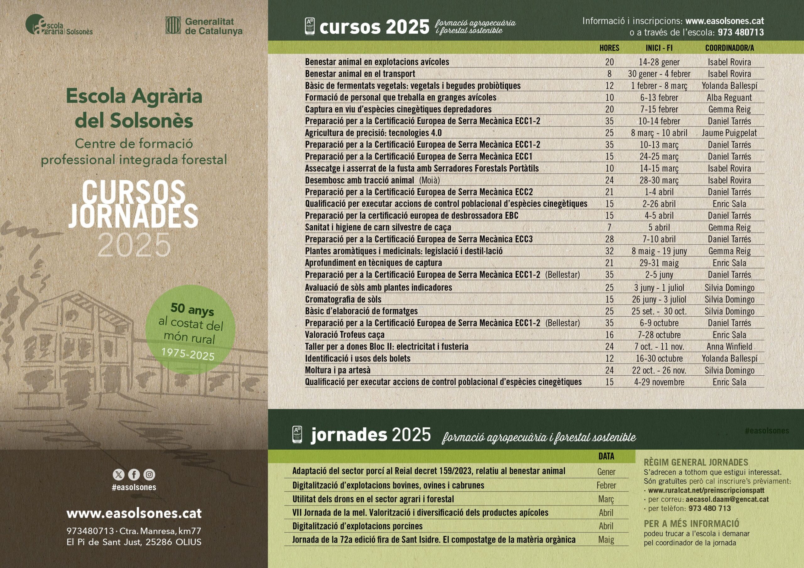 Un any més, l’Escola Agrària del Solsonès promou la formació —entesa com un procés permanent al llarg de la vida— amb l’objectiu d’afrontar i entomar canvis continuats en la trajectòria laboral. L’eina per posar en pràctica aquesta vocació educativa és la formació contínua. Enguany, el centre proposa una oferta de vint-i-vuit cursos i sis jornades tècniques referides als sectors rural i forestal.