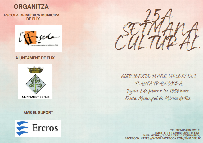25A SETMANA CULTURAL: Divendres 16 de febrer a les 19:00h, audició de l’alumnat de percussió a la sala d’audicions de l’escola municipal de música de Flix. admin16/02/24