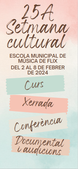 25A SETMANA CULTURAL admin01/02/24 Del 2 al 8 de febrer comença a l’escola la 25a Setmana Cultural Divendres 2 de febrer: Curs de violoncel a càrrec d’Oriol Aymat Fusté, membre del grup Blaumut i d’orquestres com Vespres d’Anardí. Us hi esperem!!!